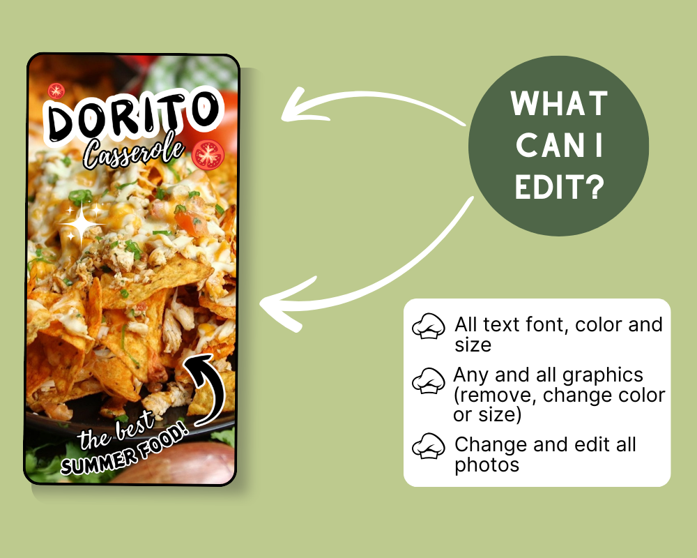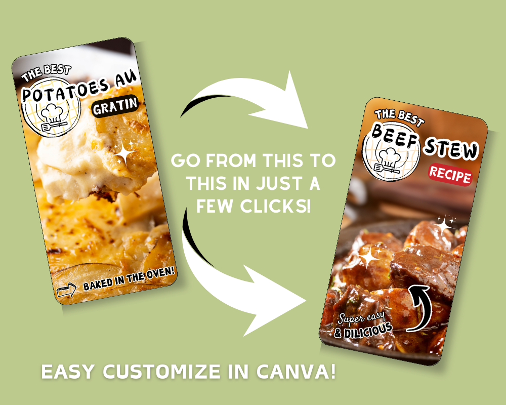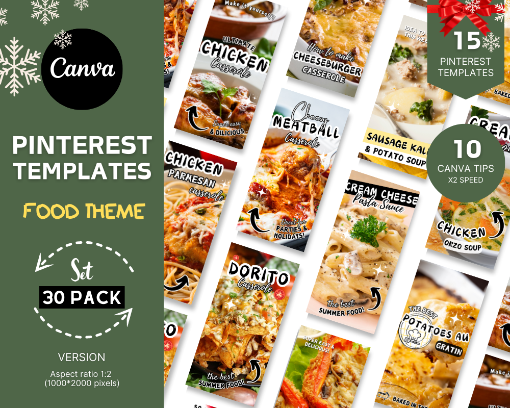 Make your food photos irresistible! These 30 Pinterest templates are designed to showcase your culinary creations in the most tempting way possible. With their optimized layout and enticing design, your dishes will look even more delicious and attract clicks, shares, and saves.